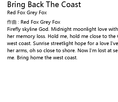 | Firefly skyline God. Midnight moonlight love with the oceans tired pulse. And her memory loss. Hold me, hold me close to the California coast. Bring home the west coast. Sunrise streetlight hope for a love I' ve known. How it felt there in her arms, oh so close to shore. Now I' m lost at sea. Won' t you come and rescue me. Bring home the west coast. |