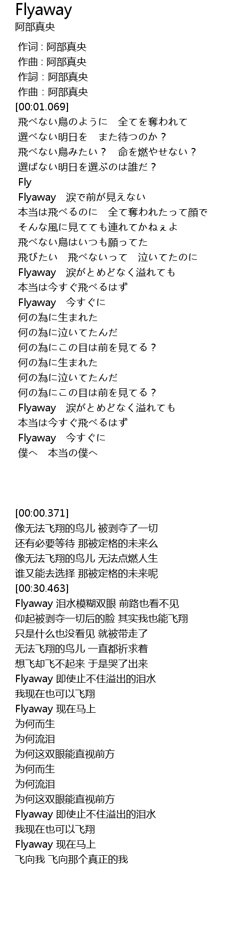 | [00:44.297] | Flyaway 涙で前が見えない |
