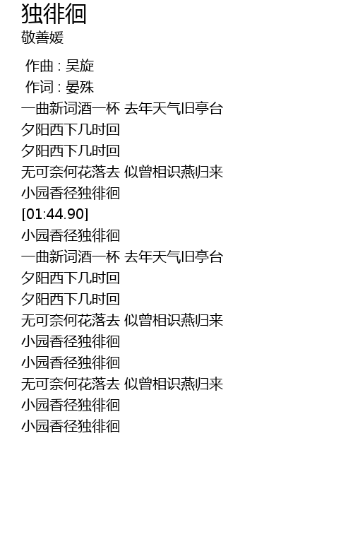 | [01:39.73] | 小园香径独徘徊 |