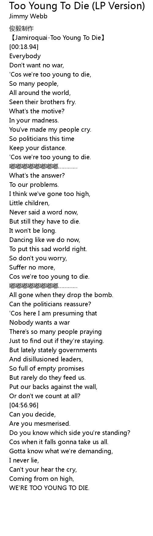 | [05:10.20] | WE' RE TOO YOUNG TO DIE. |