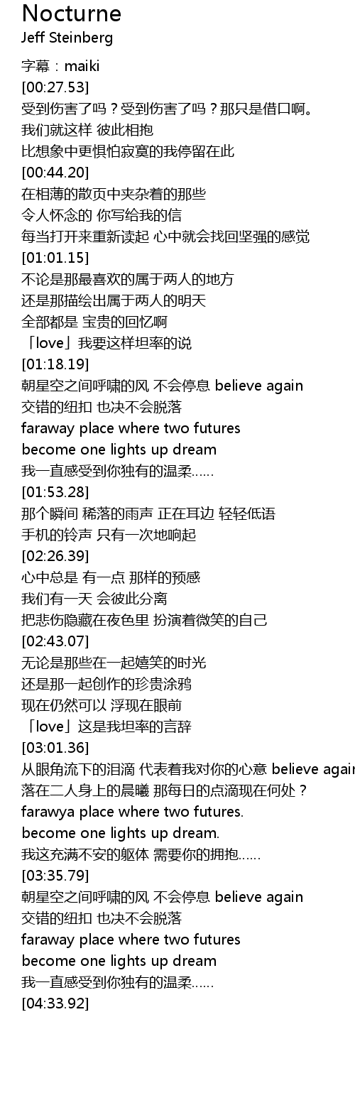 | [03:10.33] | 落在二人身上的晨曦 那每日的点滴现在何处? |