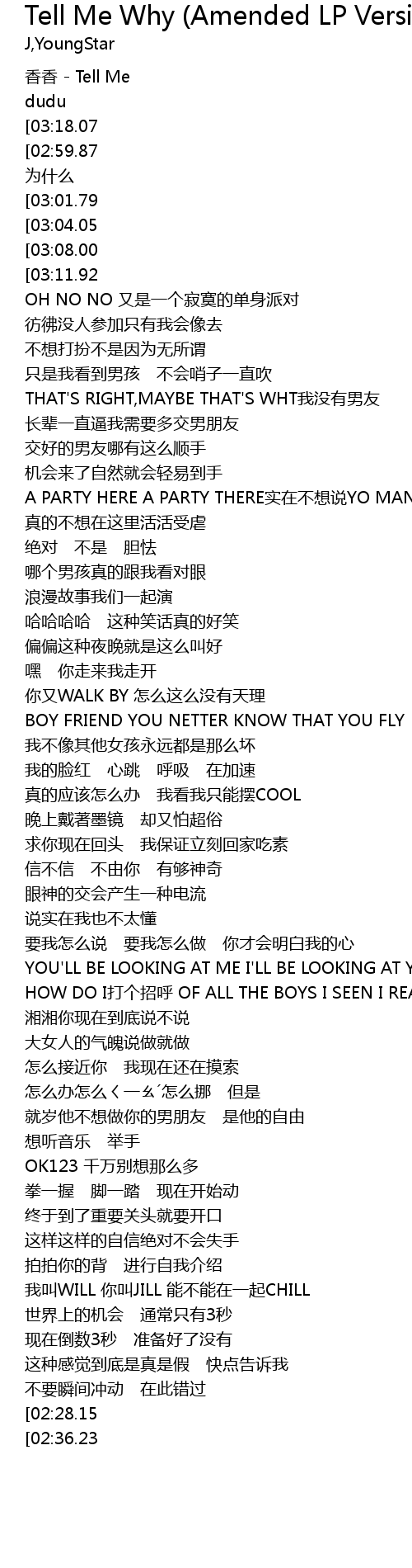 [03:32.22][02:59.87][02:43.19][01:39.45][00:51.78][00:03.43] JUST TELL ME 为什么