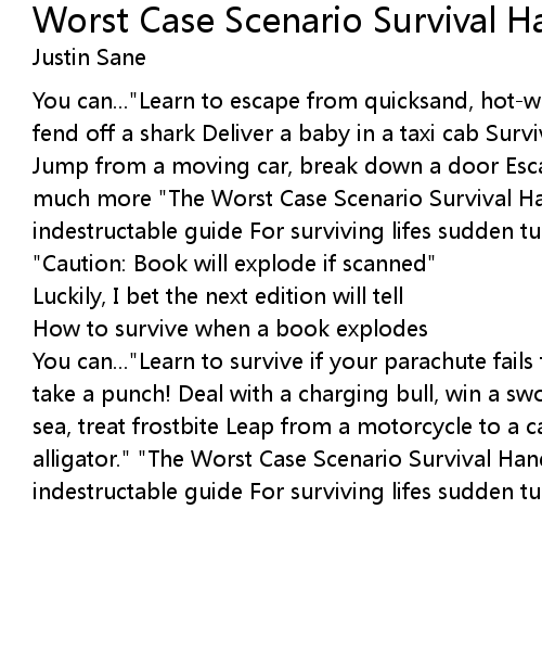 You can..."Learn to escape from quicksand, hot-wire a car Survive an avalanche, fend off a shark Deliver a baby in a taxi cab Survive a poisonous snake attack Jump from a moving car, break down a door Escape from killer bees..." and so much more "The Worst Case Scenario Survival Handbook The indispensable indestructable guide For surviving lifes sudden turns for the...WORST!" "Caution: Book will explode if scanned" |