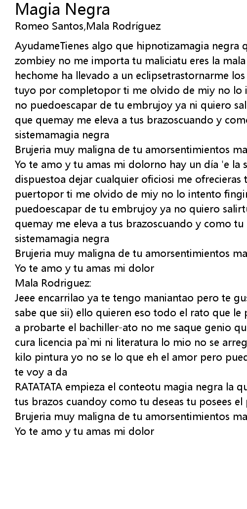 | AyudameTienes algo que hipnotizamagia negra que me hechizatu me llevas como un zombiey no me importa tu maliciatu eres la mala que quieroel vudu que tu me has hechome ha llevado a un eclipsetrastornarme los sentidoseso ya lo conseguistesoy tuyo por completopor ti me olvido de miy no lo intento fingirpor mas que trato no puedoescapar de tu embrujoy ya ni quiero salirtu magia negrala que mata la que quemay me eleva a tus brazoscuando y como tu deseastu posees el poder de mi sistemamagia negra | |