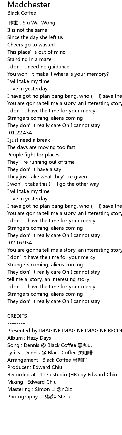 | [03:13.455] | Lyrics : Dennis Black Coffee hēi kā fēi |