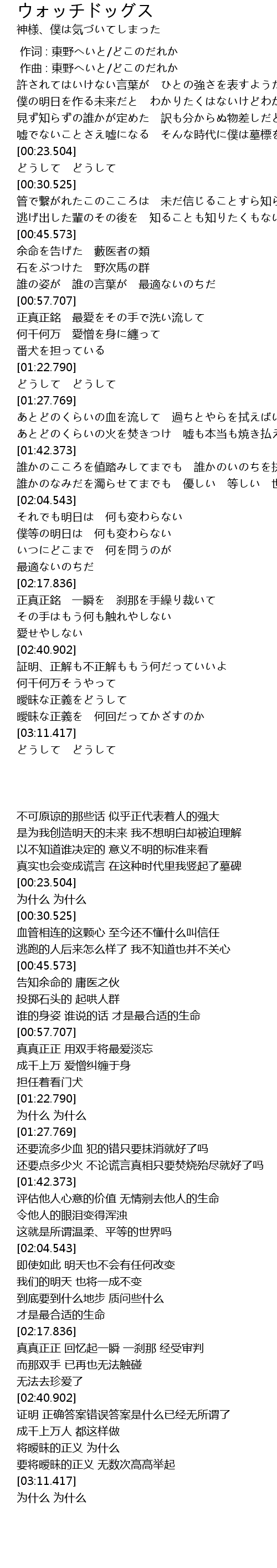 | [01:31.358] | あとどのくらいの血を流して 過ちとやらを拭えばいいの |