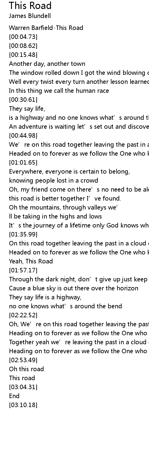 | [02:30.89] | Heading on to forever as we follow the One who knows this road |
