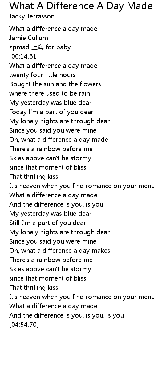 | [00:02.33] | What a difference a day made |
