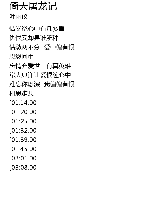 | [03:13.00][03:01.00][01:51.00] | 屠龙刀倚天剑斩不断 |