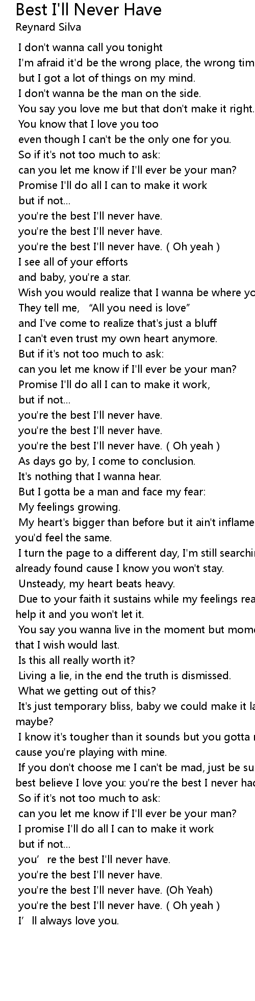 | [03:51.152] | If you don' t choose me I can' t be mad, just be sure you' re glad but best believe I love you: you' re the best I never had. |