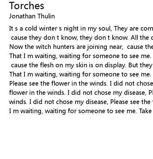 | Its a cold winters night in my soul, They are coming for me, young and old, cause they dont know, they dont know. All the choices Ive made, let me hear, Now the witch hunters are joining near, cause they dont know, they dont know. That Im waiting, waiting for someone to see me. I have hidden my face far away, cause the flesh on my skin is on display. But they dont know, they dont know. That Im waiting, waiting for someone to see me. I did not chose my disease, Please see the flower in the winds. I did not chose my disease, Please see the flower in the winds. I did not chose my disease, Please see the flower in the winds. I did not chose my disease, Please see the flower in the winds. cause Im waiting, waiting for someone to see me. Take out, Im just waiting, oh |