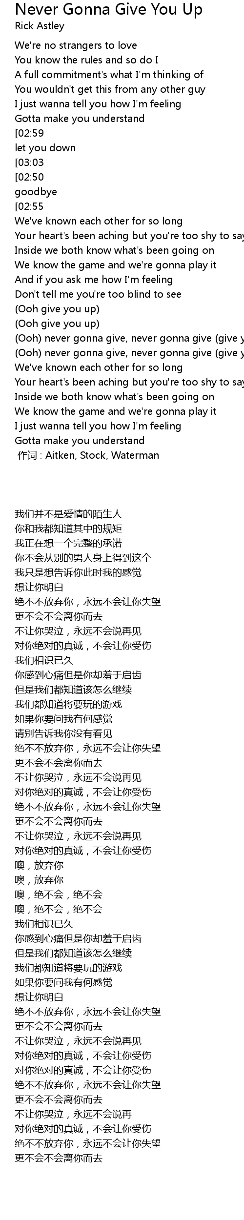 | [03:07][02:50][01:51][01:34][00:52] | Never gonna make you cry, never gonna say goodbye |