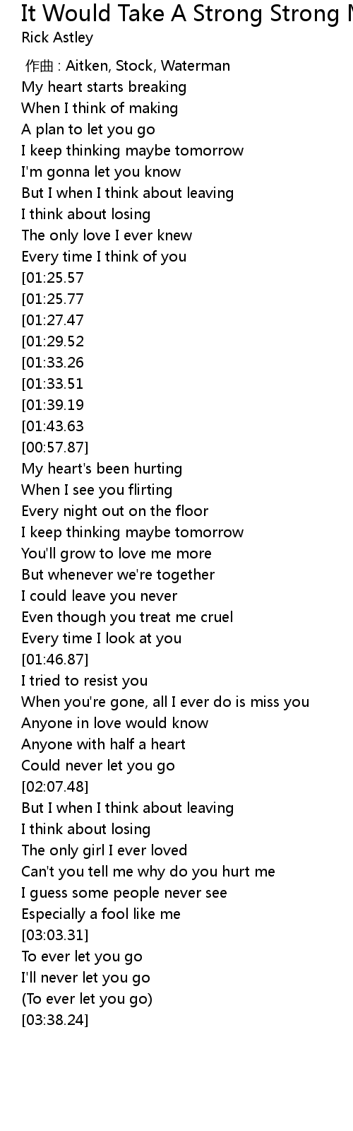 | [02:49.10][01:33.51][00:44.70] | It would take a strong, strong man |