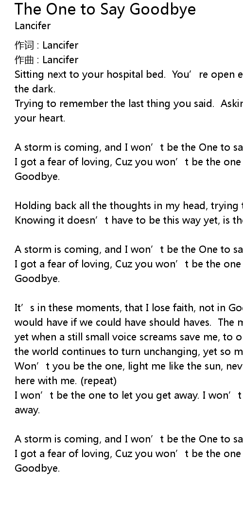 | A storm is coming, and I won' t be the One to say, the One to say Goodbye. | |
