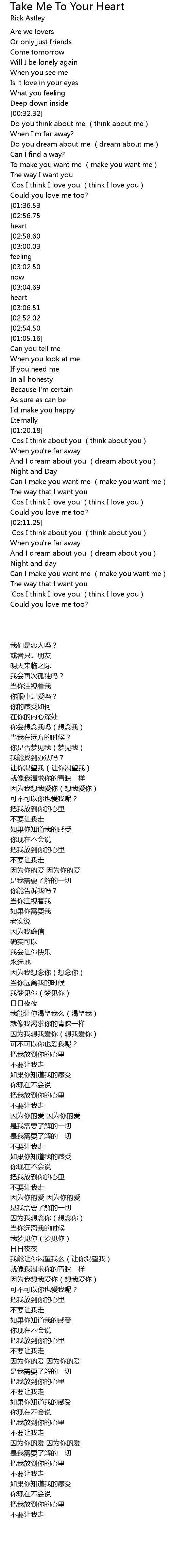 | [03:12.77][02:56.75][02:41.12][01:52.93][01:36.91][00:49.10] | Take me to your heart |