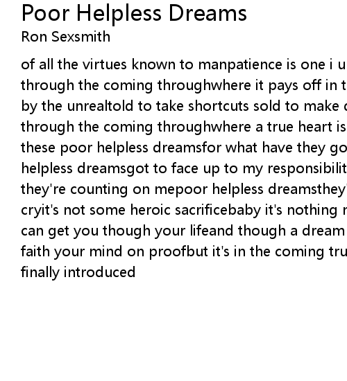 of all the virtues known to manpatience is one i understandit's in the coming through the coming throughwhere it pays off in the endwe've all been distracted by the unrealtold to take shortcuts sold to make dealsbut it's in the coming through the coming throughwhere a true heart is revealedi can't give up on all these poor helpless dreamsfor what have they got if they don't have mepoor helpless dreamsgot to face up to my responsibilitiesno they don't have much they're counting on mepoor helpless dreamsthey'll not desert you so don't you cryit's not some heroic sacrificebaby it's nothing new it's nothing newbut it can get you though your lifeand though a dream may seem aloofyour heart runs on faith your mind on proofbut it's in the coming true the coming truewhere they're finally introduced |