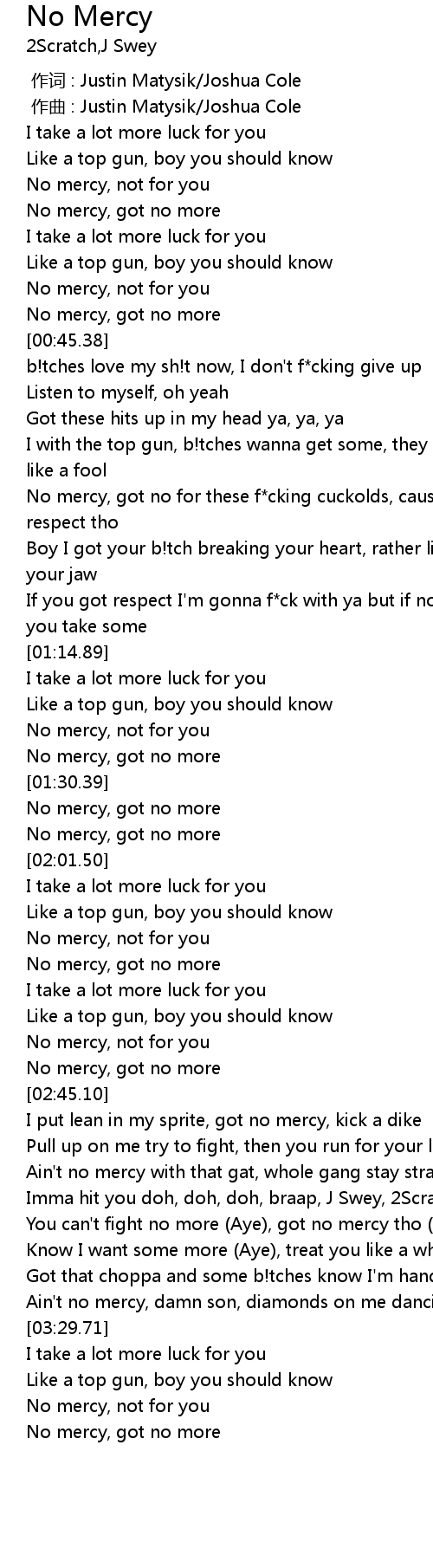 | [03:14.45] | You can't fight no more (Aye), got no mercy tho (Aye) |