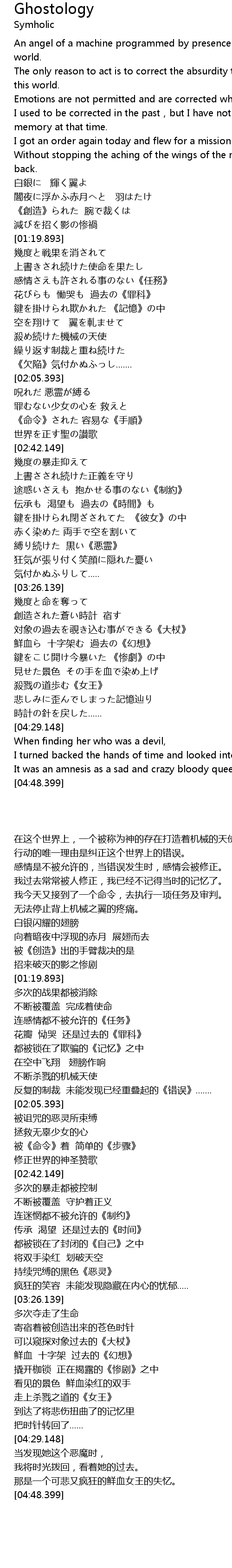 | [00:24.399] | An angel of a machine programmed by presence called god in this world. |
