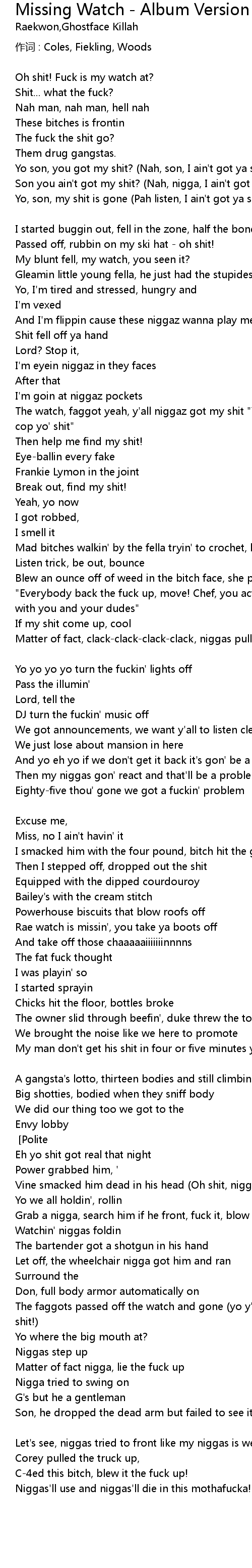 | The watch, faggot yeah, y'all niggaz got my shit "Yo Lex we family, I helped you cop yo' shit" | |