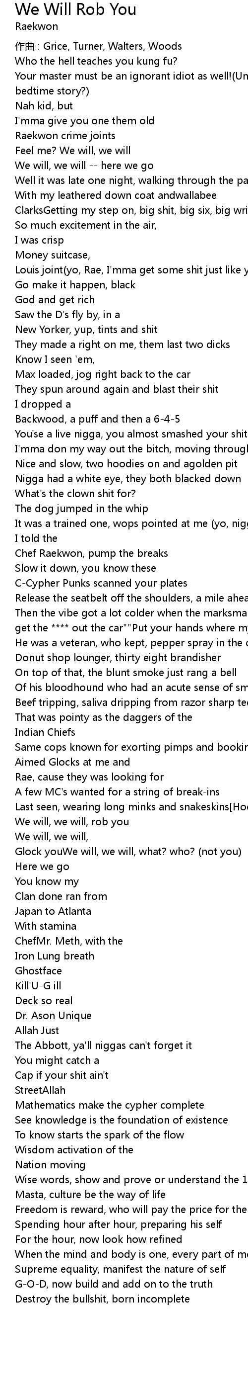 | Then the vibe got a lot colder when the marksman said"Black niggas in the Jeep, get the **** out the car""Put your hands where my eyes can see or suffer a scar" | |