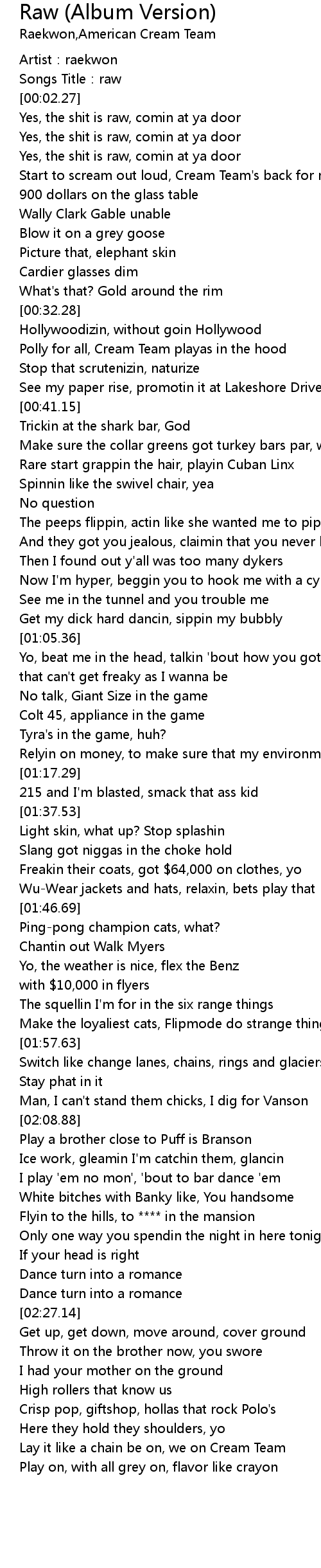 | [00:15.01] | Yes, the shit is raw, comin at ya door |