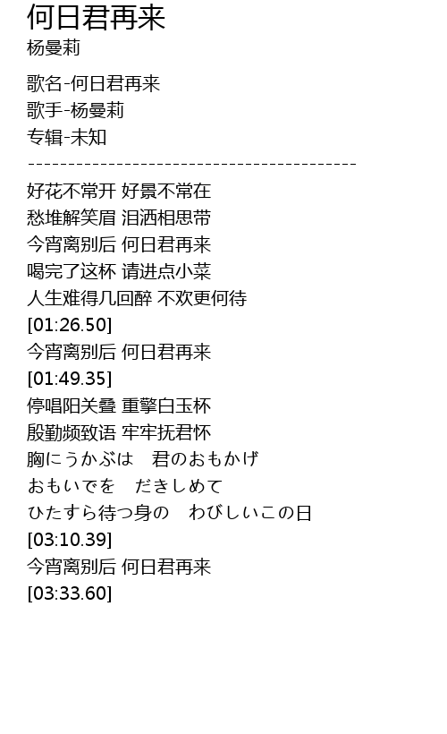 | [01:33.60] | 今宵离别后 何日君再来 |