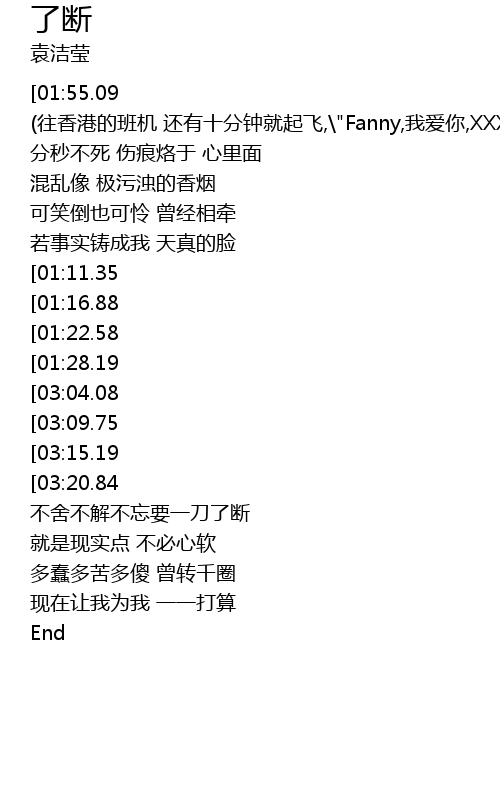 | [00:17.82] | (往香港的班机 还有十分钟就起飞,\"Fanny,我爱你,XXX\") |