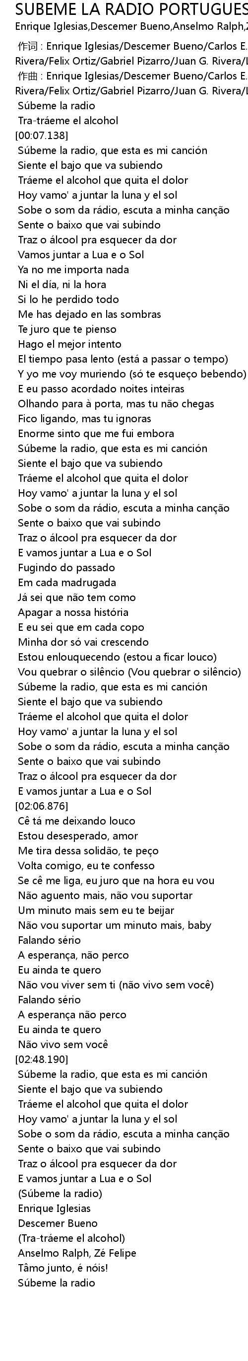 | [02:48.890] | Su beme la radio, que esta es mi cancio n |