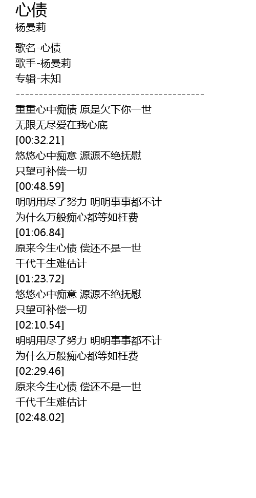 | [02:30.70] | 原来今生心债 偿还不是一世 |