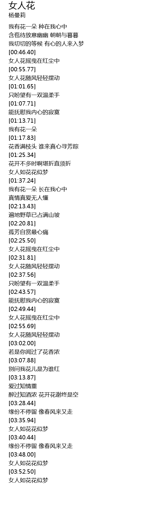 | [03:49.31] | nǚ rén rú huā huā shì mèng |