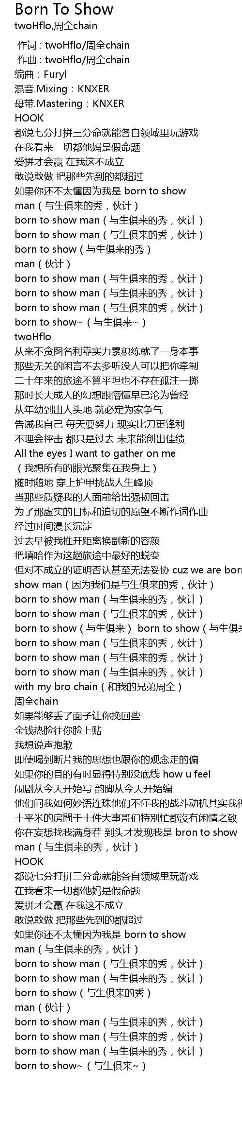 | [01:58.596] | born to show(与生俱来) born to show(与生俱来) |