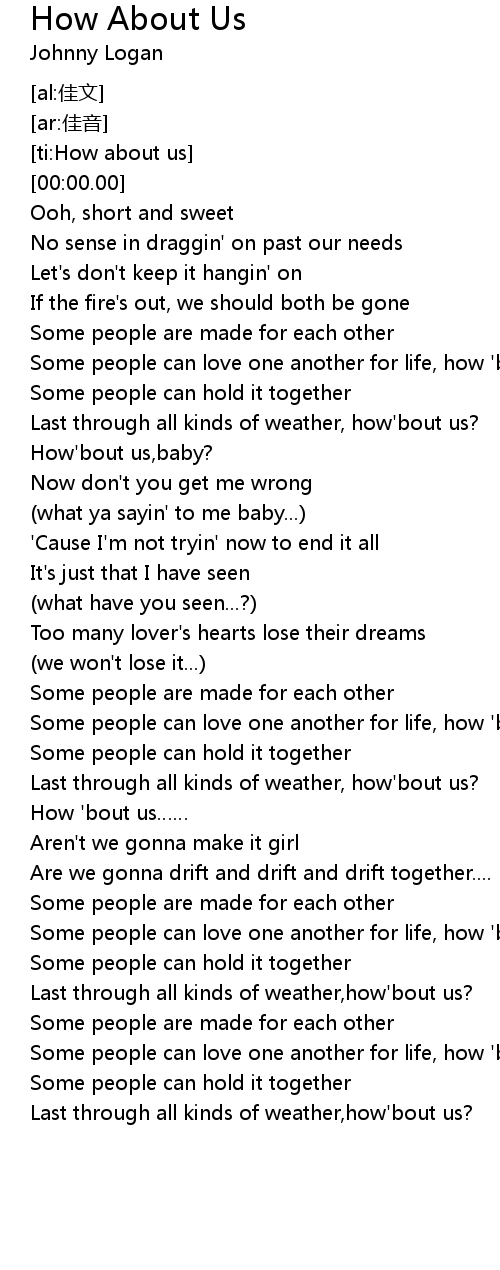 | [02:46.25] | Some people can love one another for life, how ' bout us |