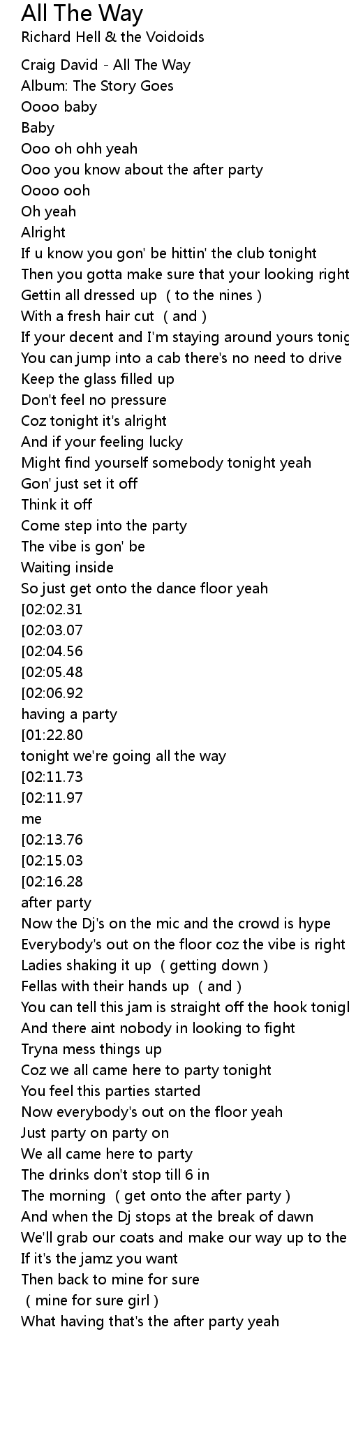 | [01:13.46][01:22.80][02:09.21][02:18.49][02:27.71][02:37.01][03:04.81][03:14.12][03:23.37][03:32.70][03:41.88][03:51.26] | Coz tonight we' re going all the way |
