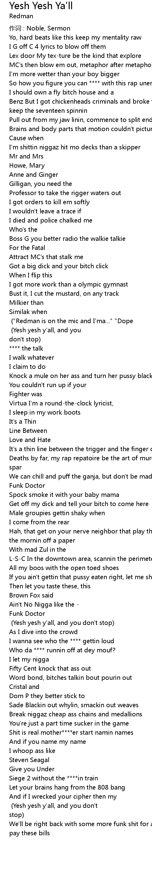 | I' m next up to bat Snoop " Redman is on the mic and I' ma..." " Dope mother er, yeah, you best ax somebody" Sermon x8 Yesh yesh y' all, and you don' t stop | |