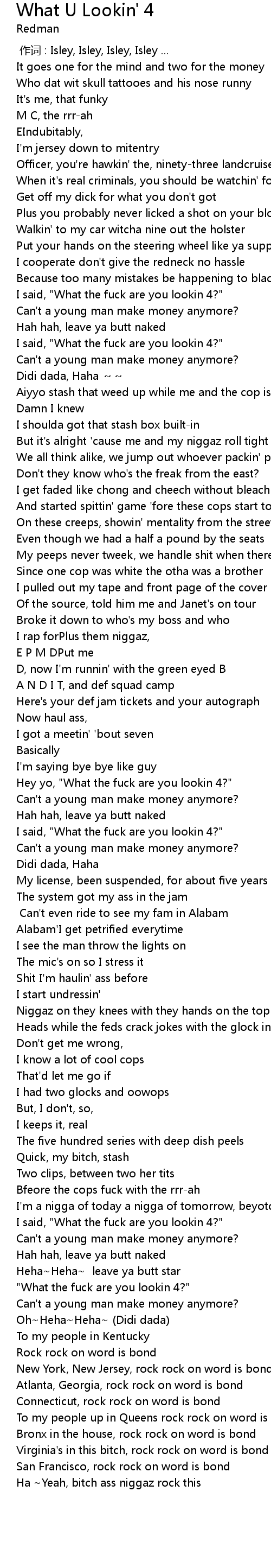 | [00:52.95] | I said, " What the fuck are you lookin 4?" |