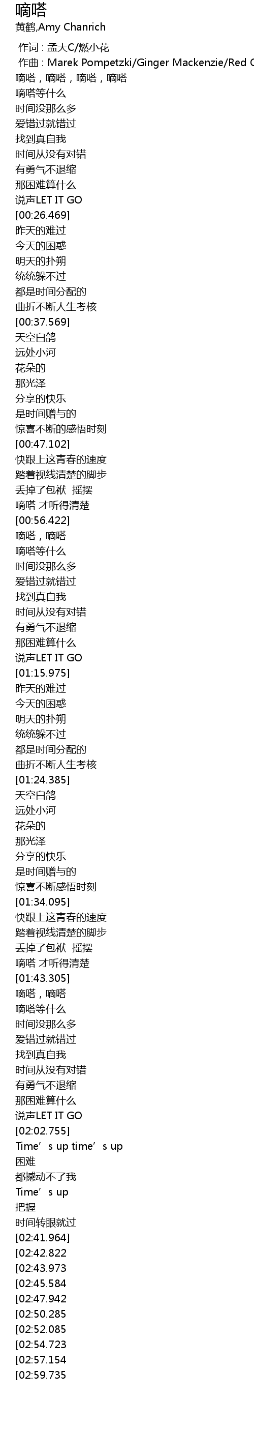 | [00:02.711] | 嘀嗒,嘀嗒,嘀嗒,嘀嗒 |