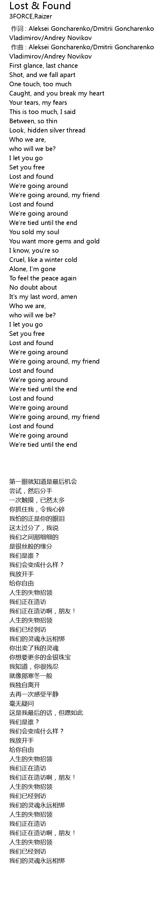 | [00:00.000] | 作词 : Aleksei Goncharenko/Dmitrii Goncharenko/Anton Vladimirov/Andrey Novikov |