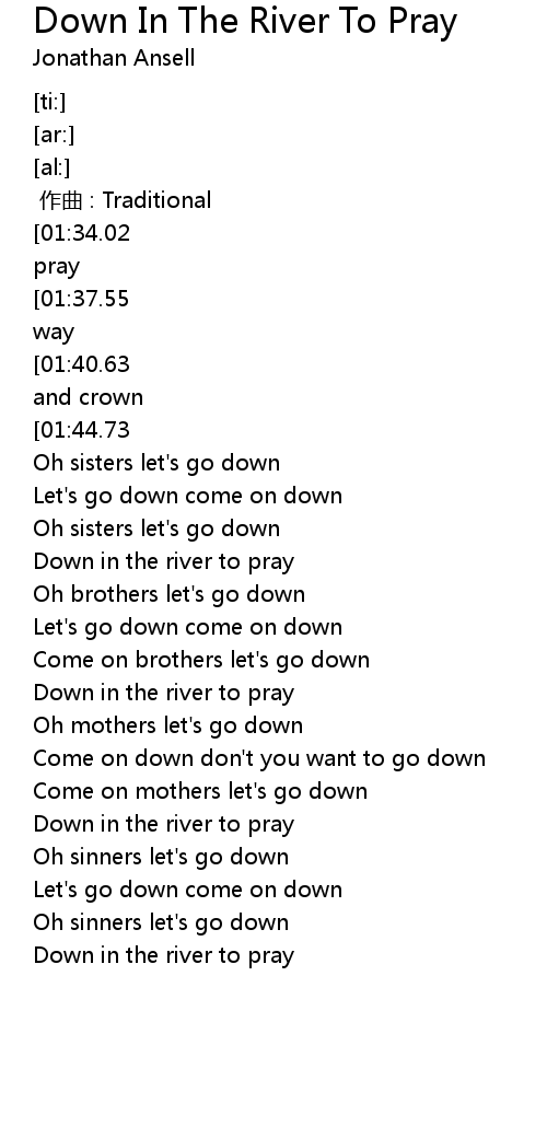 | [02:05.26][01:34.02][01:03.09][00:31.27][00:00.68] | As I went down in the river to pray |