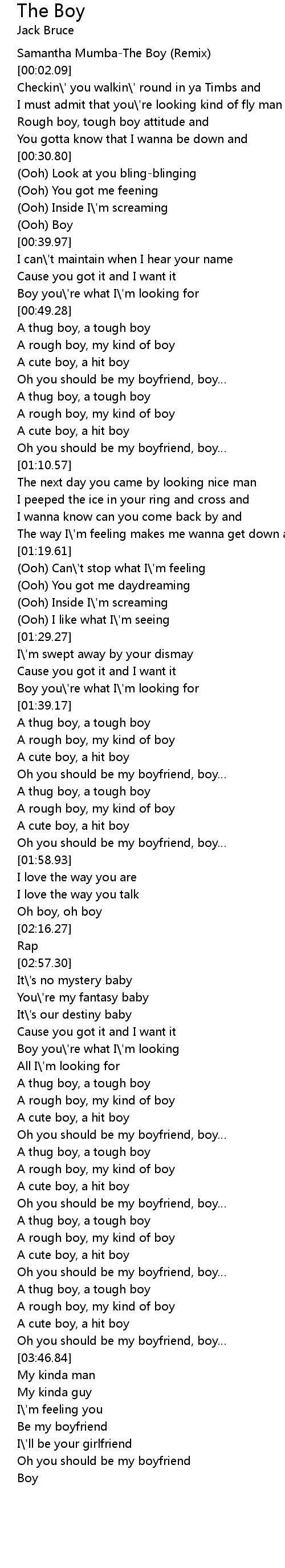 | [00:01.40] | Samantha Mumba-The Boy (Remix) |