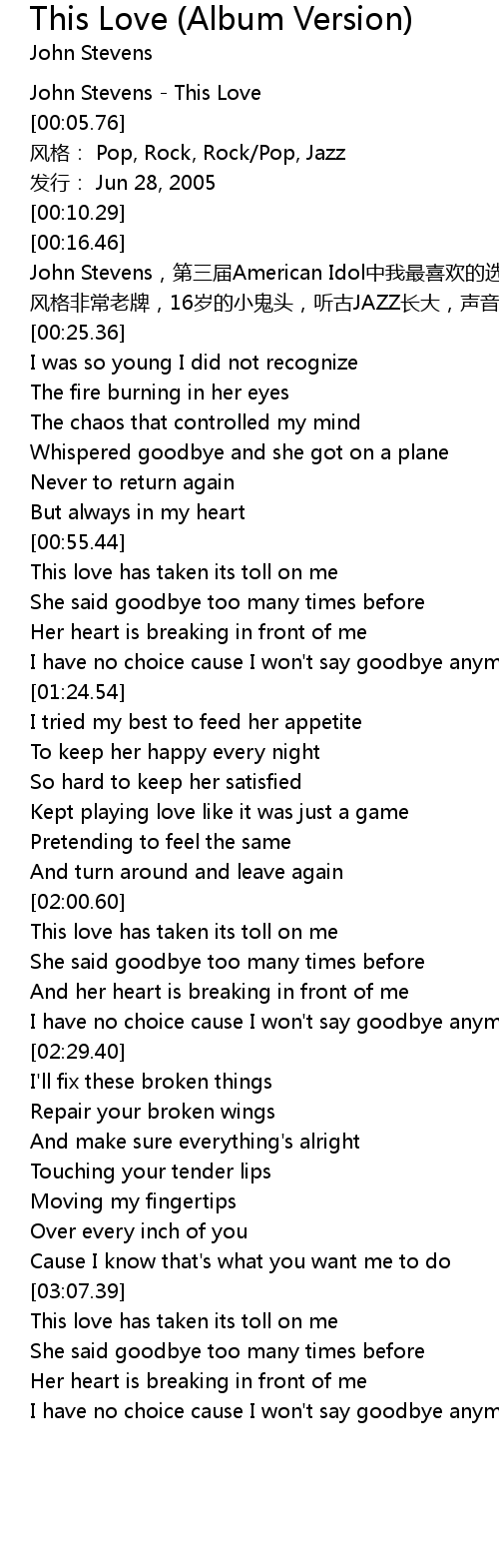 | [00:03.64] | John Stevens - This Love |