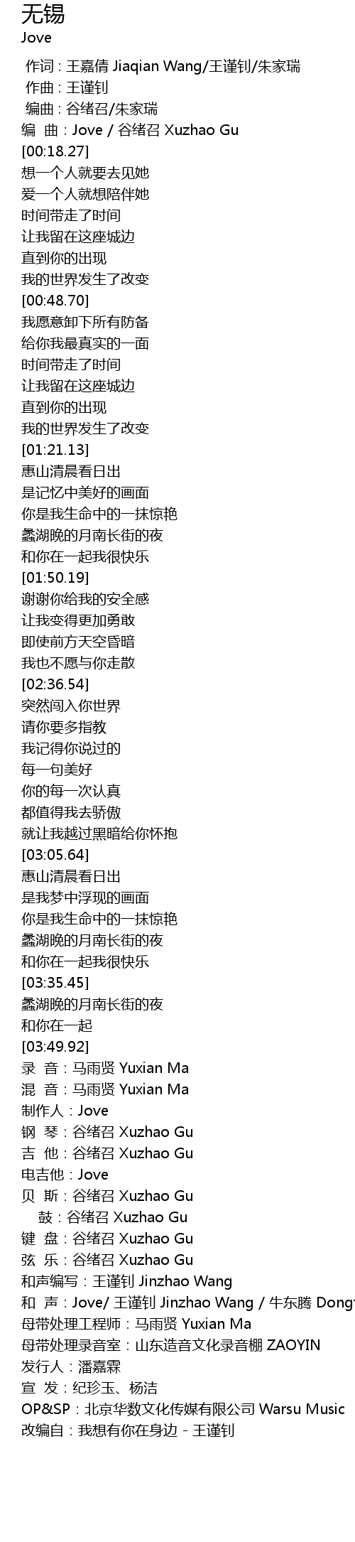 | [04:02.28] | hé shēng: Jove wáng jǐn zhāo Jinzhao Wang niú dōng téng Dongteng Niu |