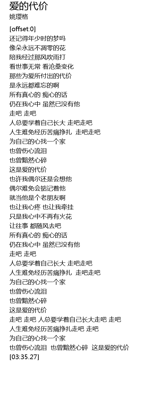 | [03:26.08] | 也曾伤心流泪 也曾黯然心碎 这是爱的代价 |