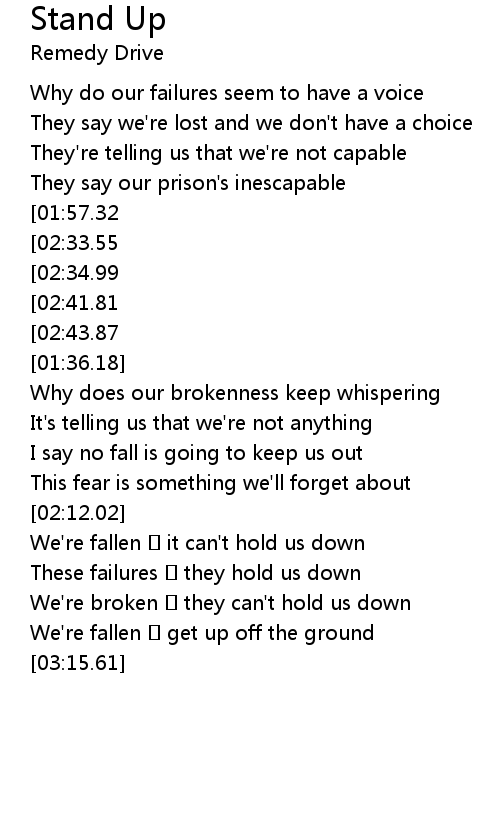 | [02:51.34][02:33.55][01:57.49][01:21.99] | Stand up now |