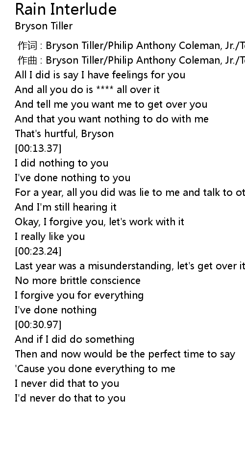 | [00:00.000] | 作词 : Bryson Tiller/Philip Anthony Coleman, Jr./Teddy Walton |