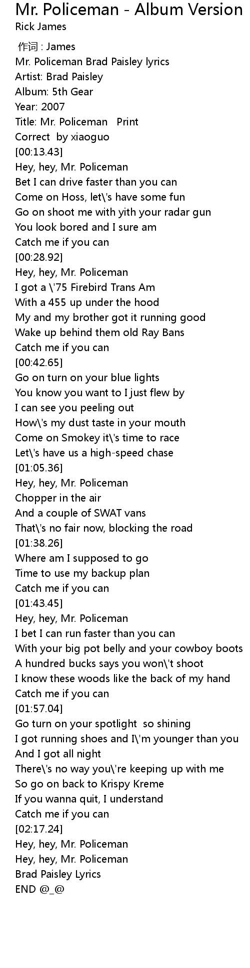 | [00:05.01] | Mr. Policeman Brad Paisley lyrics |