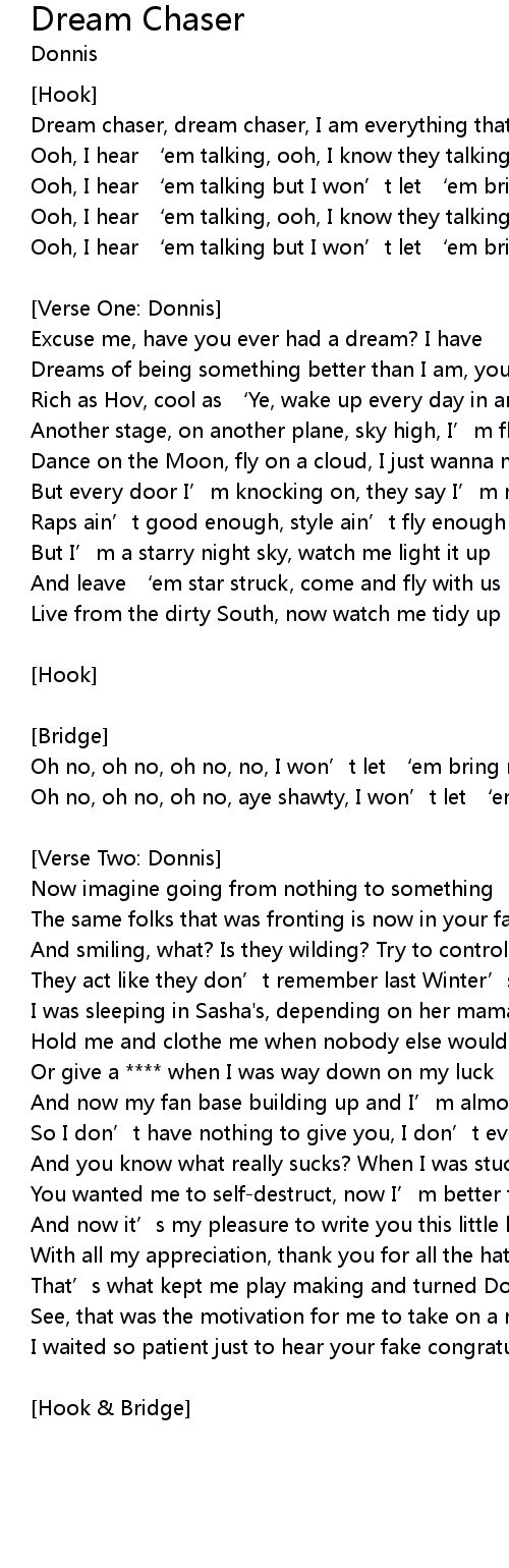 | Dream chaser, dream chaser, I am everything that dreams are made of | |