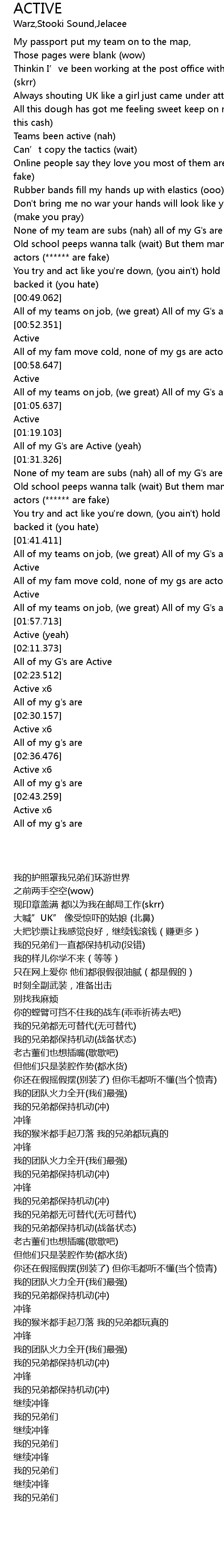 | [00:39.307] | None of my team are subs (nah) all of my G's are Active (ohh) |