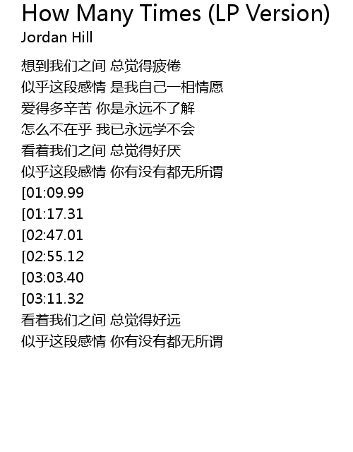 | [03:33.94][02:47.01][01:26.98] | 几滴眼泪 才能代表一次伤悲 |