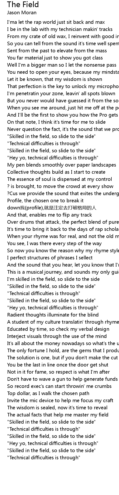 | [00:53.010] | " Skilled in the field, so slide to the side" |