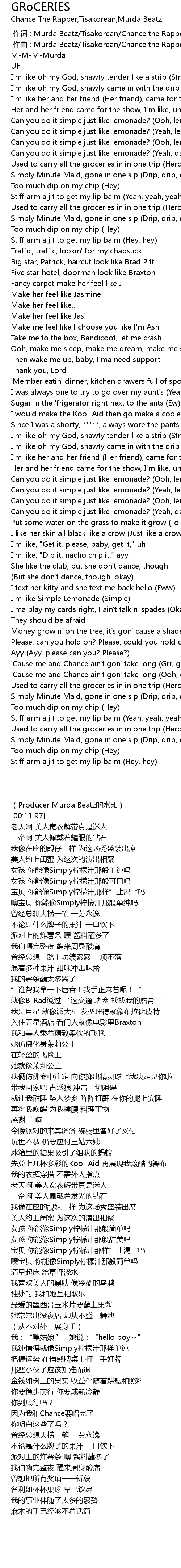 | [00:30.14] | Can you do it simple just like lemonade? Yeah, lemonade |